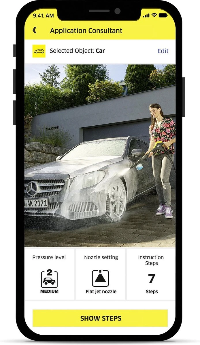 Verbind de hogedrukreiniger K 7 Smart Control eenvoudig via Bluetooth met de Kärcher Home & Garden-app op je smartphone – en het schoonmaken wordt veel eenvoudiger en efficiënter. Omdat de toepassingshulp in de app praktische tips en tricks geeft over veel schoonmaaksituaties en schoonmaakobjecten. De app biedt ook vele andere handige functies, zoals montage-instructies, verzorgings- en onderhoudsinstructies, evenals het Kärcher-serviceportaal.