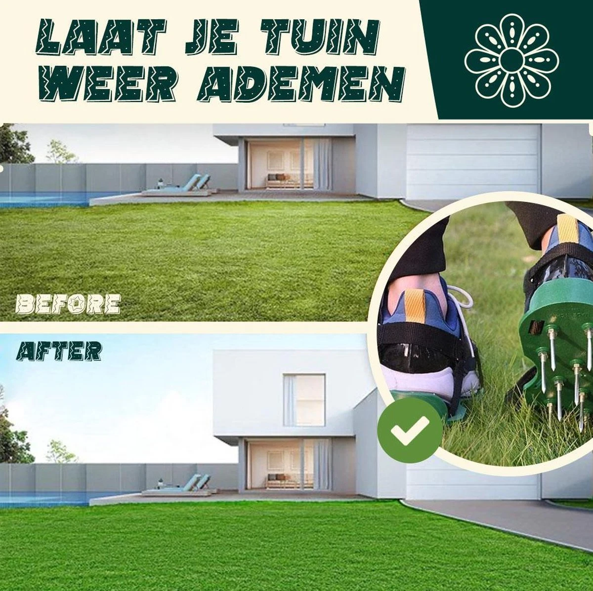 De wortels van de grassprieten hebben lucht nodig, wat het opnemen van water en voedingsstoffen bevordert. Wanneer er geen lucht bij kan, zal je gras niet meer gezond en groen blijven. Met deze schoenen belucht je binnen no time je gehele gazon, wat zorgt voor mooie, stevige grassprieten. Het is als het ware een wandeling door je tuin waarbij je ondertussen je gazon belucht!